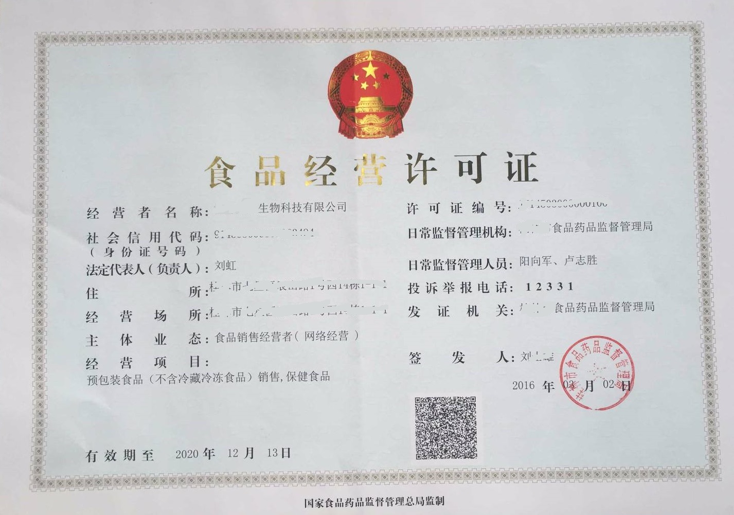 2016年新版食品生產(chǎn)許可證